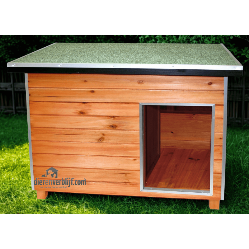 Dit stevige en degelijke hondenhok is tot in de puntjes afgewerkt. Langs de randen zijn aluminium strips bevestigd ter bescherming van het hout. De hond kan in dit hok geheel tochtvrij liggen vanwege het tochtschot.