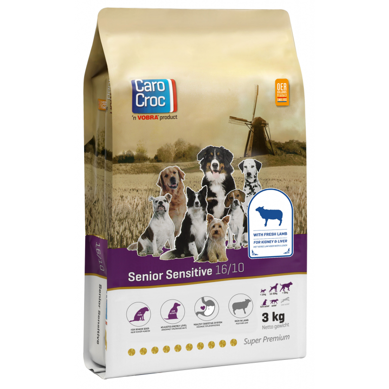 CaroCroc Senior Sensitive 16/10 is speciaal afgestemd op de behoefte van oudere honden. Het ondersteunt de nier- en leverfunctie. CaroCroc Senior Sensitive bevat omega-3 en -6 vetzuren en 37% lam.