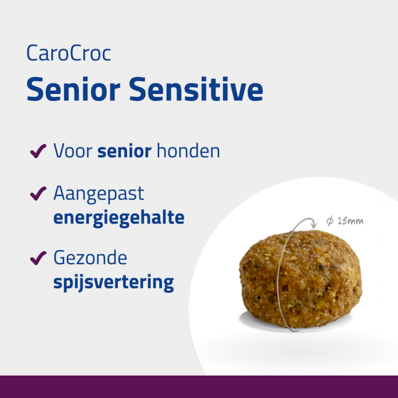 Naarmate je hond ouder wordt, verandert zijn voedingsbehoefte. Oudere honden (vanaf ongeveer 7 jaar) hebben een lagere eiwit- en mineralenbehoefte. Voor het welzijn van je hond is het belangrijk de voeding hierop aan te passen. CaroCroc Senior Sensitive is bereid met verse lam.