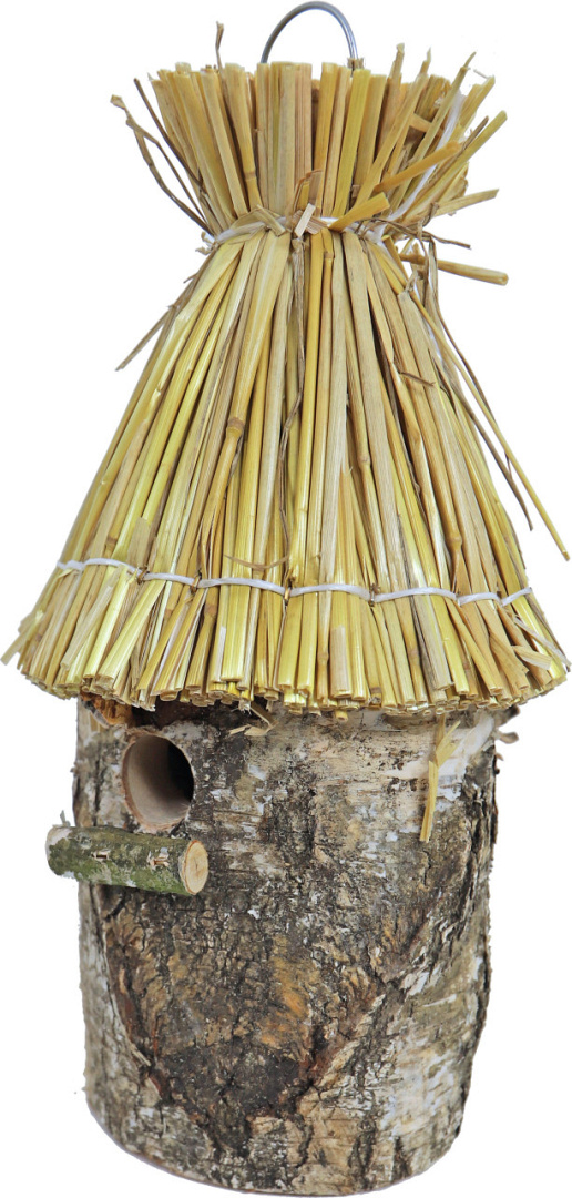 Dit leuke vogelhuisje heeft een puur natuurlijke look en is gemaakt van berkenhout en een dak van stro.