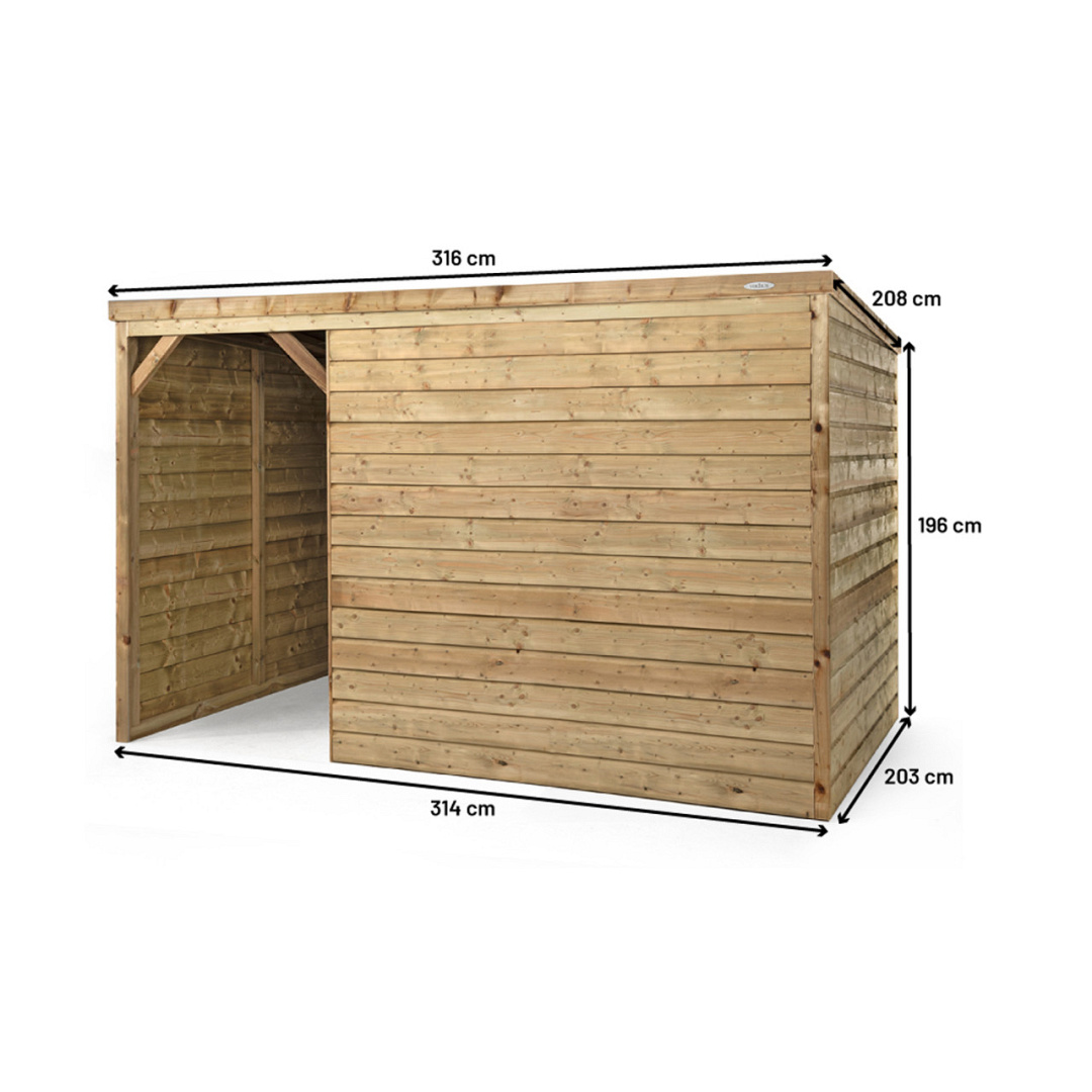De stal met een grondoppervlakte van (L) 314 x (B) 203 centimeter (buitenmaat) is opgebouwd op een geïmpregneerd grenenhouten frame en afgedicht met rabatdelen van grenenhout. Door het gebruik van behandelde materialen biedt deze schuilstal minimaal 10 – 15 jaar plezier voor jouw dieren én jezelf, want de stal is ook nog eens onderhoudsvrij. Het dak is schuin aflopend en voorzien van sterk dakleer voor een optimale afwatering op de stal en bescherming van jouw dieren.