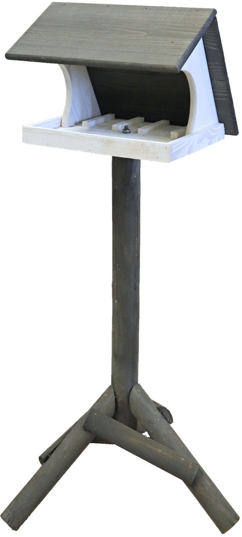 Staand voederplateau op poot met schuin houten dak en pindakaaspothouder met ruimte voor twee potten.
