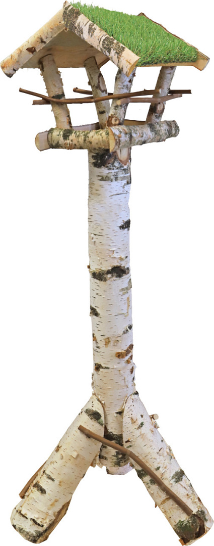 Het voederhuis berken met gazon (kunstgras) dak op poot is een duurzaam voederhuis voor vele soorten buitenvogels.