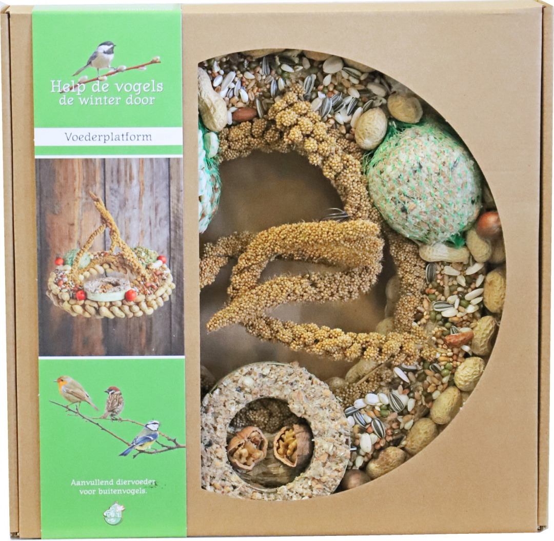 De voederplatform voor buitenvogels is een aanvullend diervoeder gevuld met verschillende lekkernijen zoals een pindanet, mezenbol en vetring.