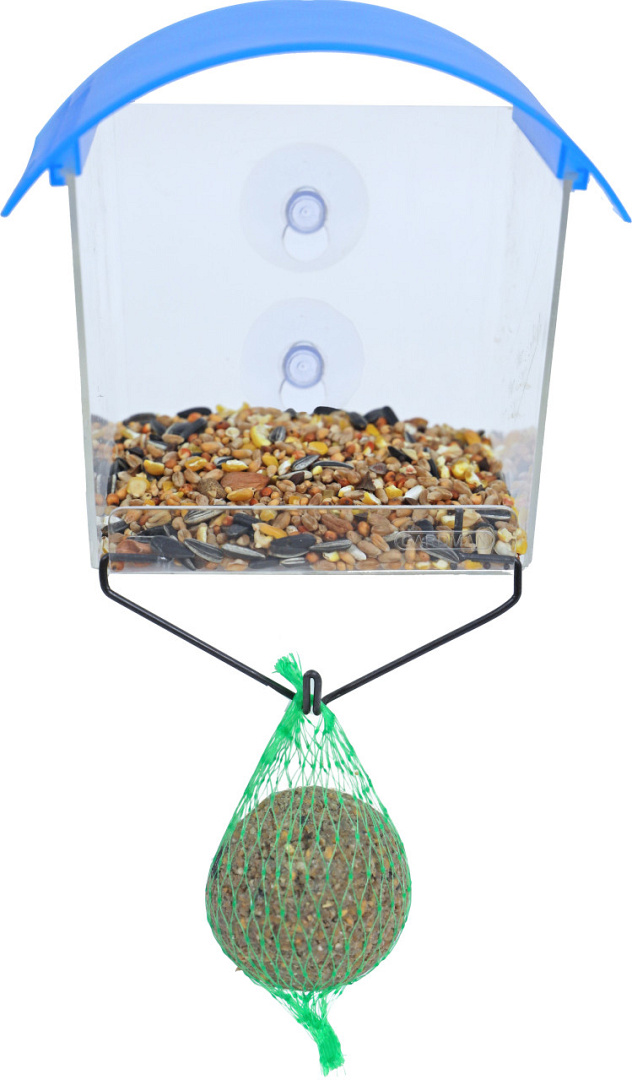 Plastic doorzichtige window feeder met mezenbolhouder. Eenvoudig aan het raam te bevestigen door middel van 2 zuignappen.