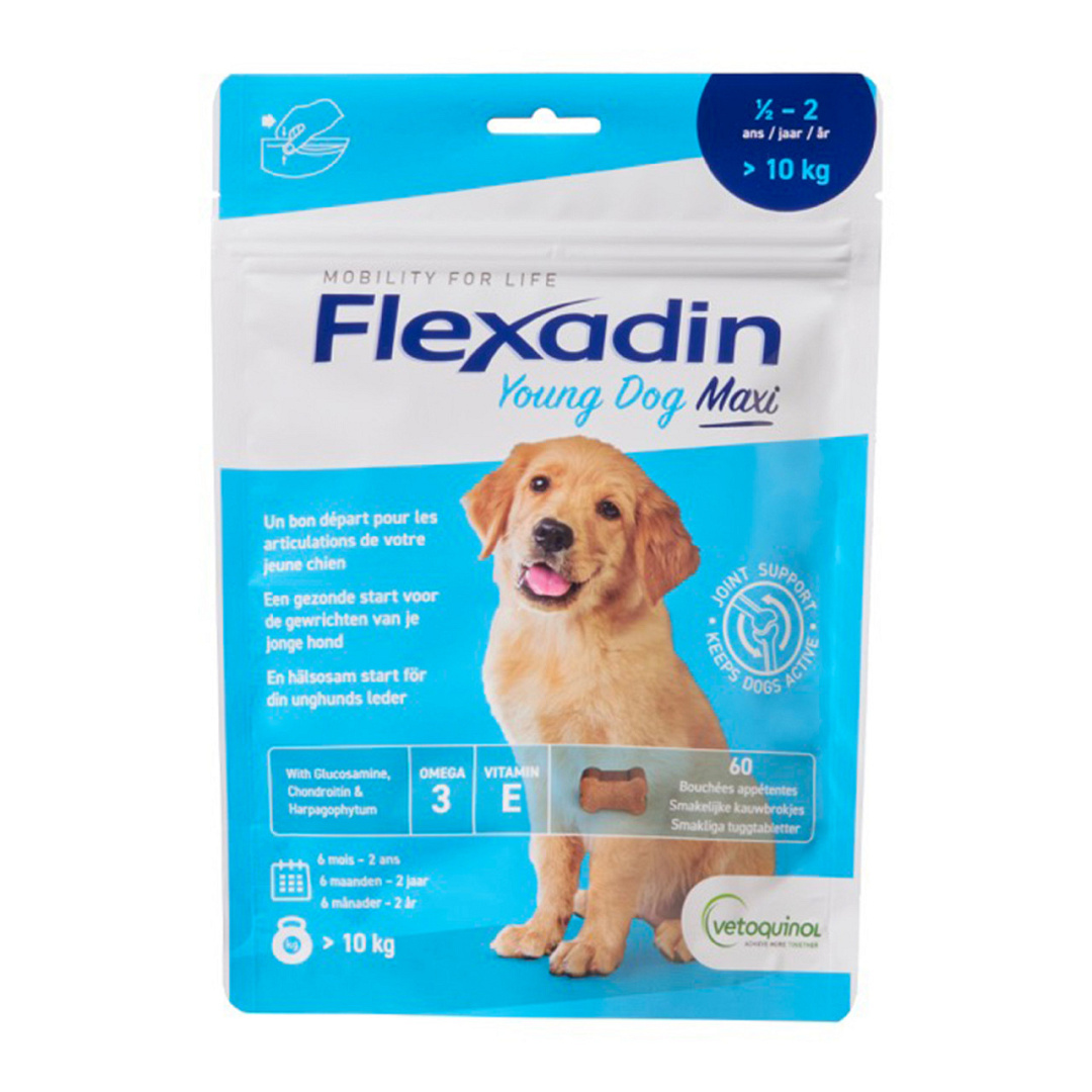 Flexadin Young Maxi is geschikt voor honden jonger dan 2 jaar en vanaf 10 kg. Het bevat Glucosamine en Chondroïtine, essentiele bouwstenen voor het kraakbeen, en onder andere Duivelsklauw (Harpagophytum procumbens), een heilzame plant waarvan het wortelextract al heel lang gebruikt wordt om de gewrichten te ondersteunen. Bovendien is Flexadin zeer makkelijk te geven.