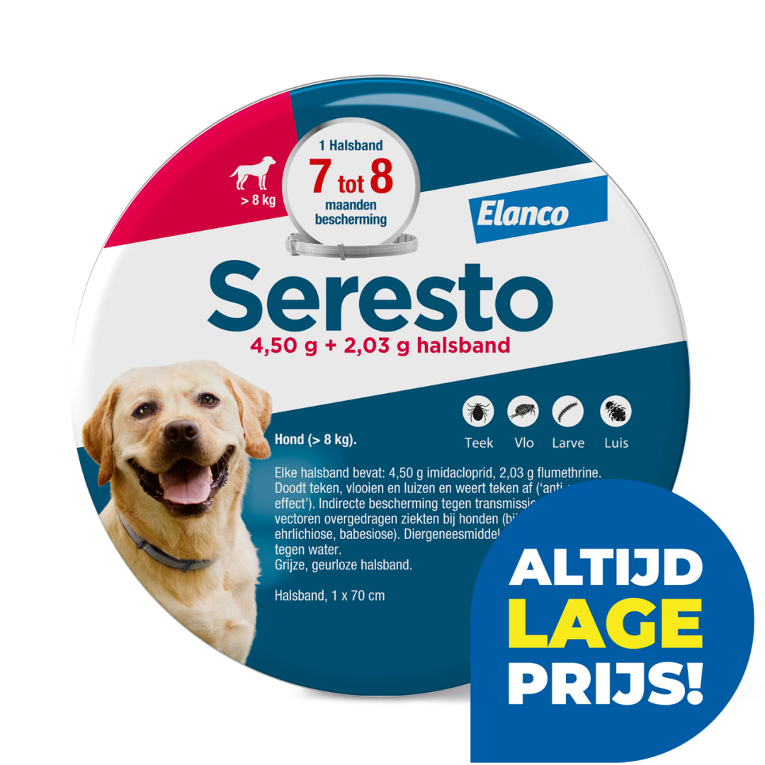 Geurloos halsband ter preventie van vlooien, teken en luizen voor honden zwaarder dan 8 kg. Werkt tot 8 maanden lang.