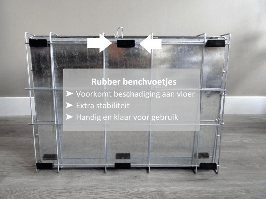 De metalen hondenbench is een stevige en praktische bench die je hond een veilige rustplek biedt. De bench heeft twee deuren, waardoor hij altijd makkelijk toegankelijk is. Dankzij de uitneembare lade maak je hem eenvoudig schoon en met het handvat verplaats je de bench zonder moeite. Voor extra comfort leg je er een kleed of vetbed in, zodat je hond zich direct thuis voelt. Zet je de bench op hout, parket of laminaat, dan zijn rubberen voetjes aan te raden om krassen te voorkomen.