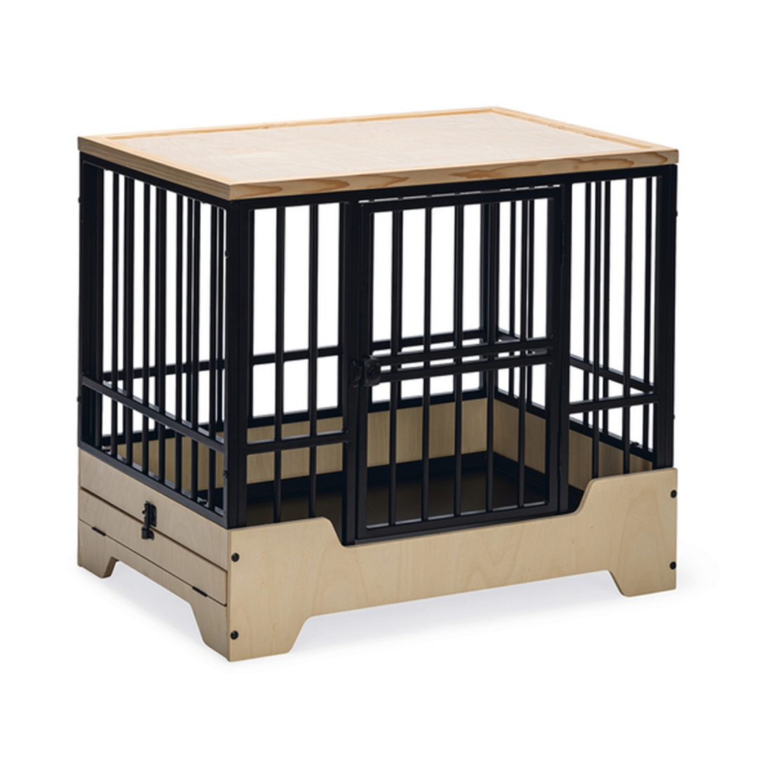 Geef jouw hond een prachtige eigen veilige omgeving die ook nog eens mooi staat binnen jouw interieur met deze Designed by Lotte hondenbench Quirine. De bench heeft een stevig metalen frame en een licht houten onder- en bovenkant. Daarnaast is de bench voorzien van een verhoogde instap en een deur aan de voorkant met een draaisluiting.Bovendien beschikt de bench over een zwarte, uitneembare lade, gemaakt van metaal. Deze lade zit verstopt achter het houten klapframe. Door toevoeging van de lade, maak je de bench schoon in een handomdraai.