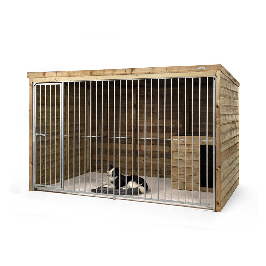 Onderhoudsvrije hondenkennel met nachthok en voorpaneel met spijlen van gegalvaniseerd ijzer.