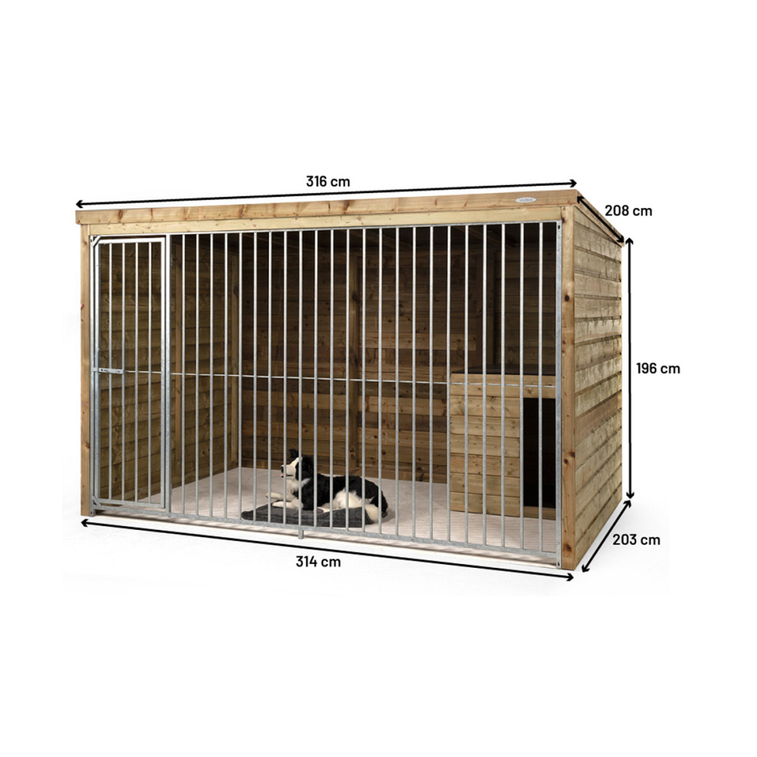 De kennel is opgebouwd met drie gesloten wanden, het voorpaneel is volledig van spijlen. Het spijlpaneel is gegalvaniseerd en heeft stevige spijlen van 16 mm dikte.