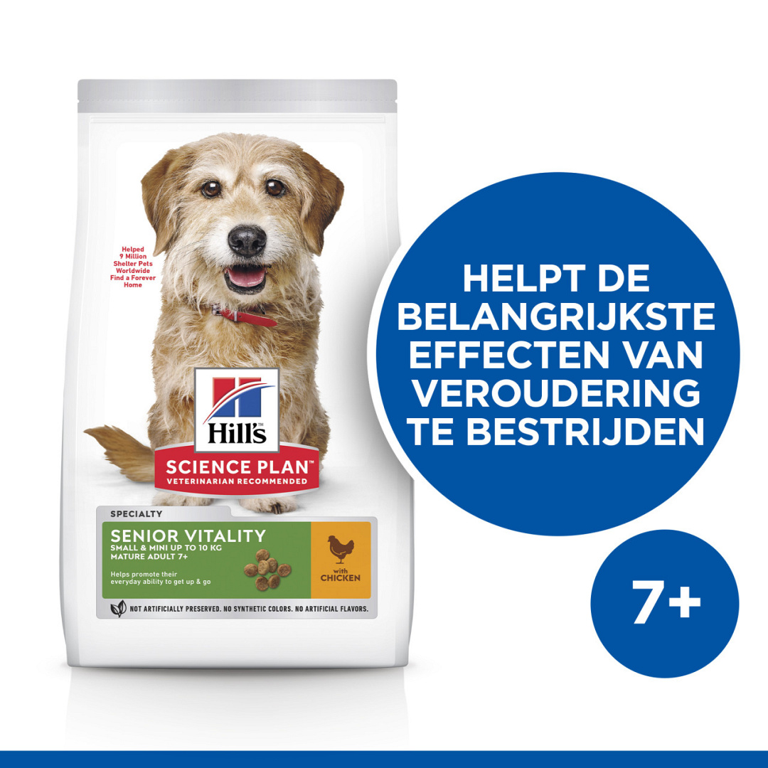 Hill's Science Plan hondenvoer Mature Adult Senior Vitality Small & Mini met kip voor kleine honden om elegant ouder te worden. Speciaal ontworpen brokgrootte met de precieze balans van ingrediënten om de hersenfunctie, interactie en energie te helpen ondersteunen.