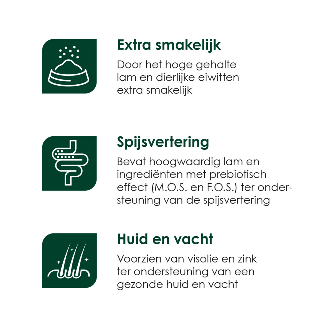 | Spijsvertering Bevat hoogwaardig lam en ingrediënten met prebiotisch effect (M.O.S. en F.O.S.) ter ondersteuning van de spijsvertering. |