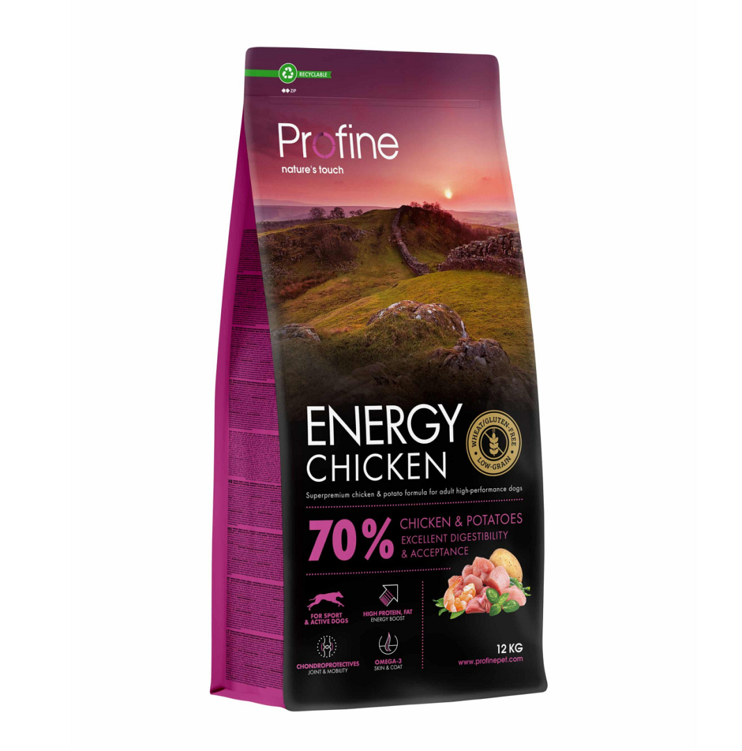 Profine Hondenvoer Energy Chicken is een natuurlijke hondenvoeding op basis van kip en aardappel die speciaal ontwikkeld is voor volwassen honden die hoge prestaties leveren.