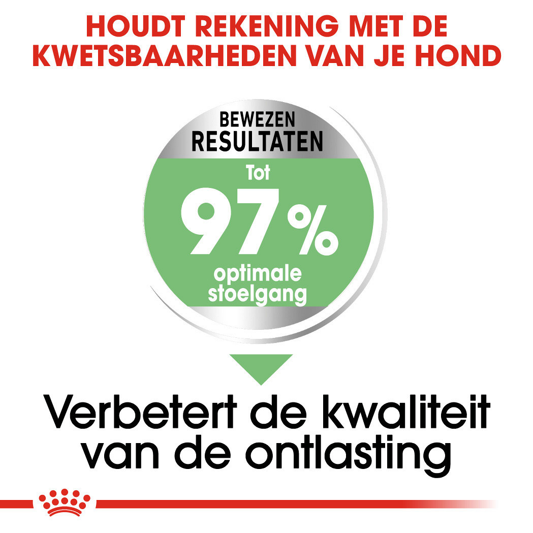 Royal Canin Digestive Care Maxi geeft in 97 procent van de gevallen een optimale stoelgang, het bewijs van een gezonde spijsvertering. Royal Canin Digestive Care Maxi heeft zijn succes bewezen.