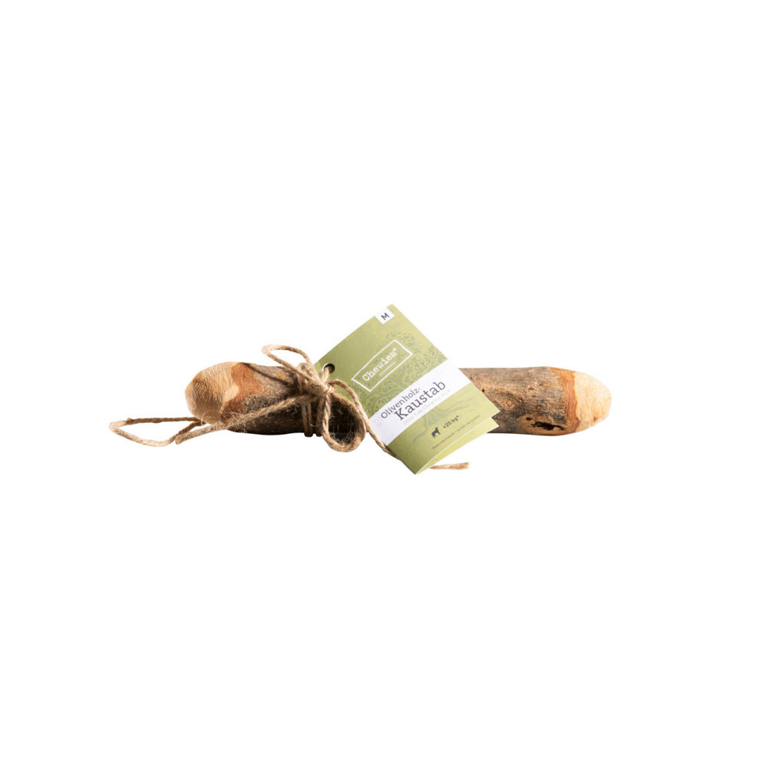 Kauwstok van olijfhout, voor langdurig kauwplezier zonder splinters.