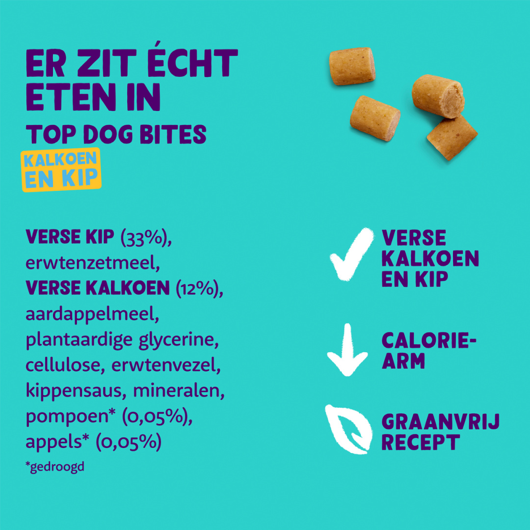 Ingrediënten: verse kip 33%, erwtenzetmeel, verse kalkoen 12%, aardappelmeel, plantaardige glycerine, cellulose, erwtenvezel, kippensaus, mineralen, pompoen (gedroogd) 0,05%, appels (gedroogd) 0,05%.