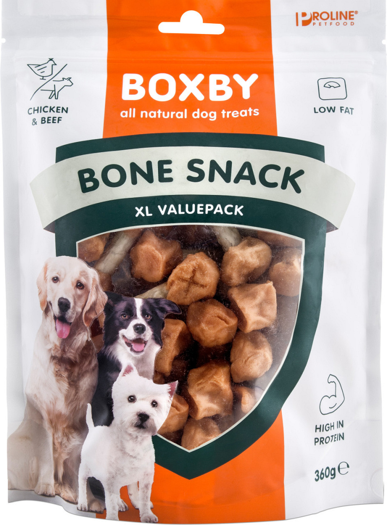 Proline Boxby Bone Snack is een eiwitrijke hondensnack met een krokant laagje. De snacks bevatten een laag vetgehalte en zijn glutenvrij.