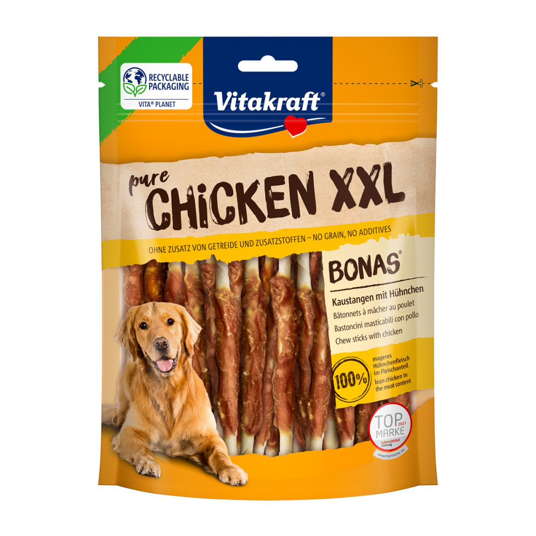Ontdek de Chicken Bonas XXL van Vitakraft. Een absolute verrassing voor elke meatlover! Daarnaast bevat deze hondensnack geen graan, soja, ei en vleesmeel. Een pure traktatie voor elke doerak!