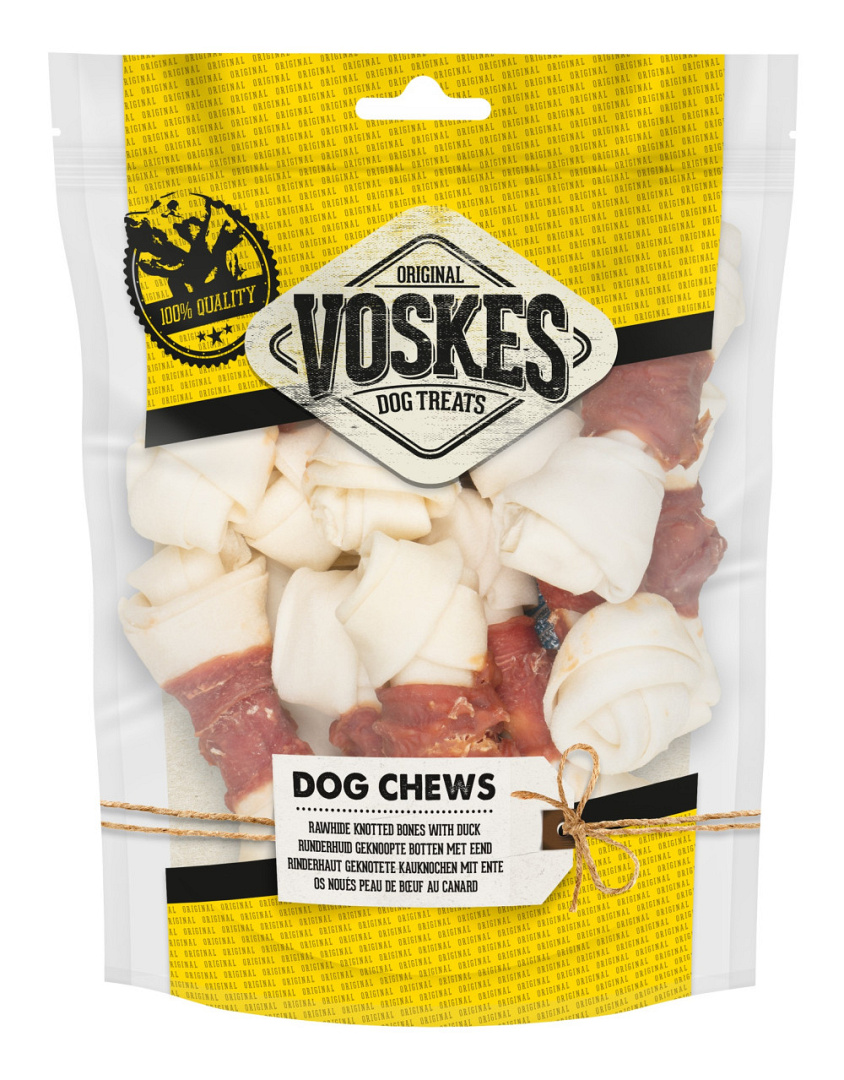 Hondensnack Voskes Geknoopte botten runderhuid met eend is een mix van kauwkluiven gemaakt van blanke runderhuid en eend. 100% natuurlijke ingrediënten zonder toevoegingen. Een heerlijke, natuurlijke kauwsnack. Activeert het kauwgedrag en draagt bij aan een gezond gebit.