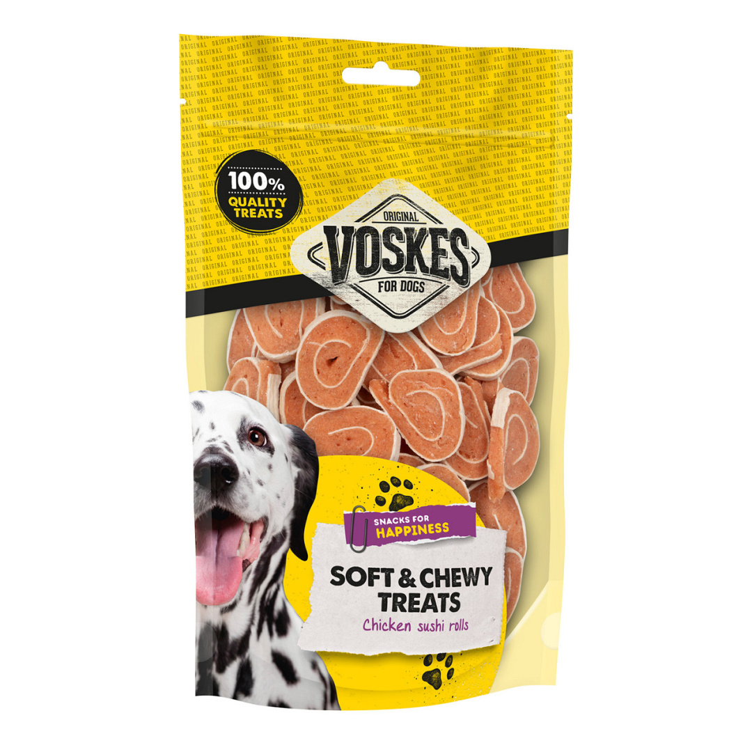 De Voskes kip sushi rolls zijn lekkere, halfzachte snacks, met kipfilet en heerlijke kabeljauw in een mooie sushivorm. Deze traktatie zit boordevol dierlijke eiwitten door het hoge gehalte aan kip en vormt dus een gezond tussendoortje voor jouw viervoeter!