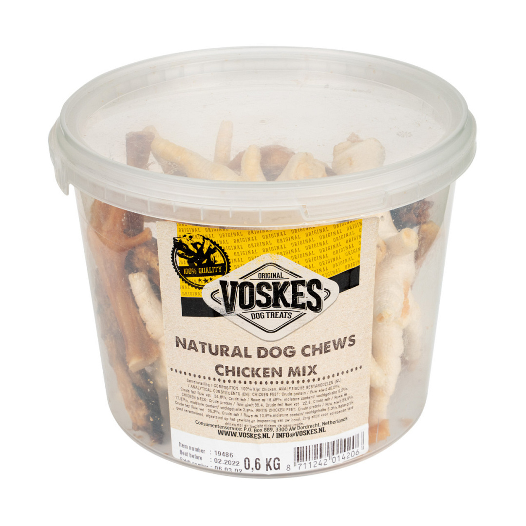 De Voskes Mix Bucket chicken is gevuld met verschillende soorten kipproducten voor de hond, zoals kippenvleugels, kippenpoten en kippennekken. 100% natuurlijke producten die een overheerlijke en verantwoorde traktatie zijn voor jouw hond.