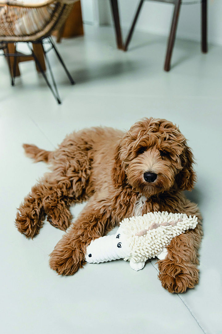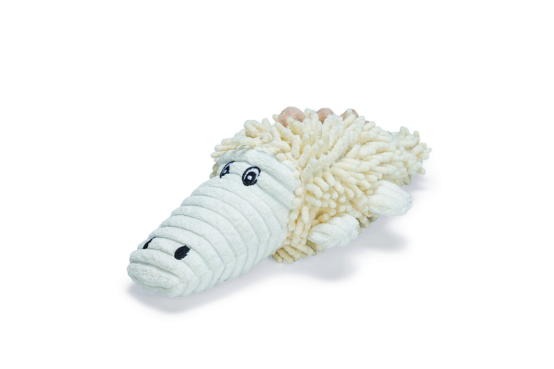 Heerlijk zachte hondenknuffel in de vorm van een krokodil, om mee te spelen of tegenaan te kruipen. Gemaakt van gerecycled materiaal. Geluidloos.