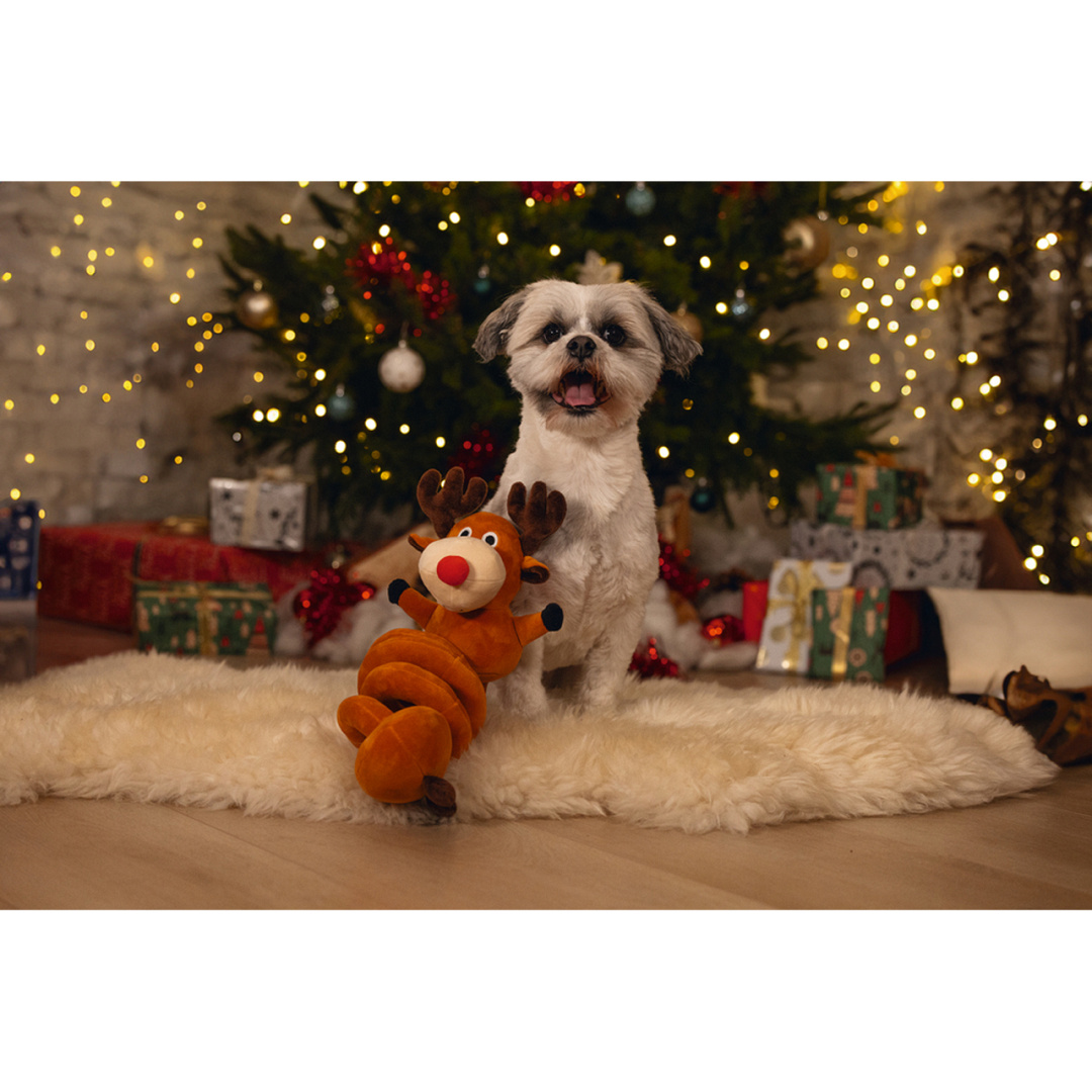 Superleuk hondenspeeltje in kerstthema. Met springveer en piep voor extra speelplezier.