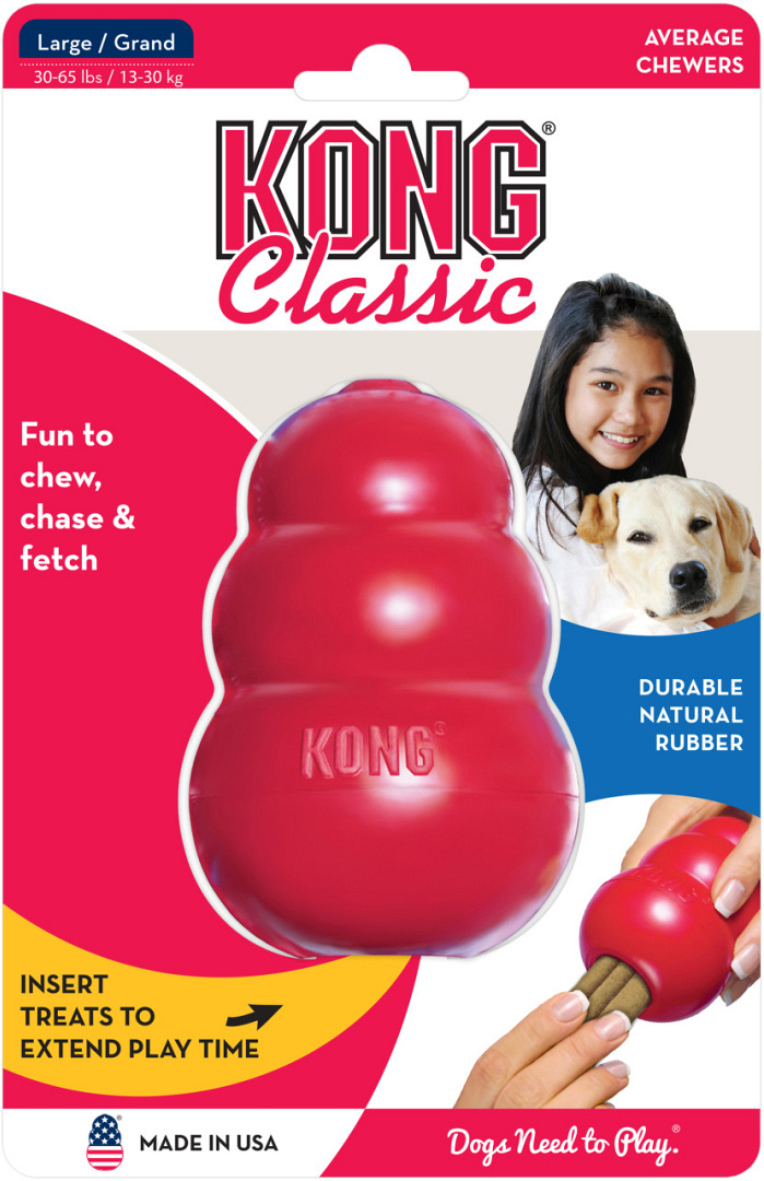 De Kong Classic is het bekende sterke hondenspeeltje, gemaakt van het superveerkrachtige mengsel van rood, natuurlijk rubber en is perfect voor honden die van kauwen houden.