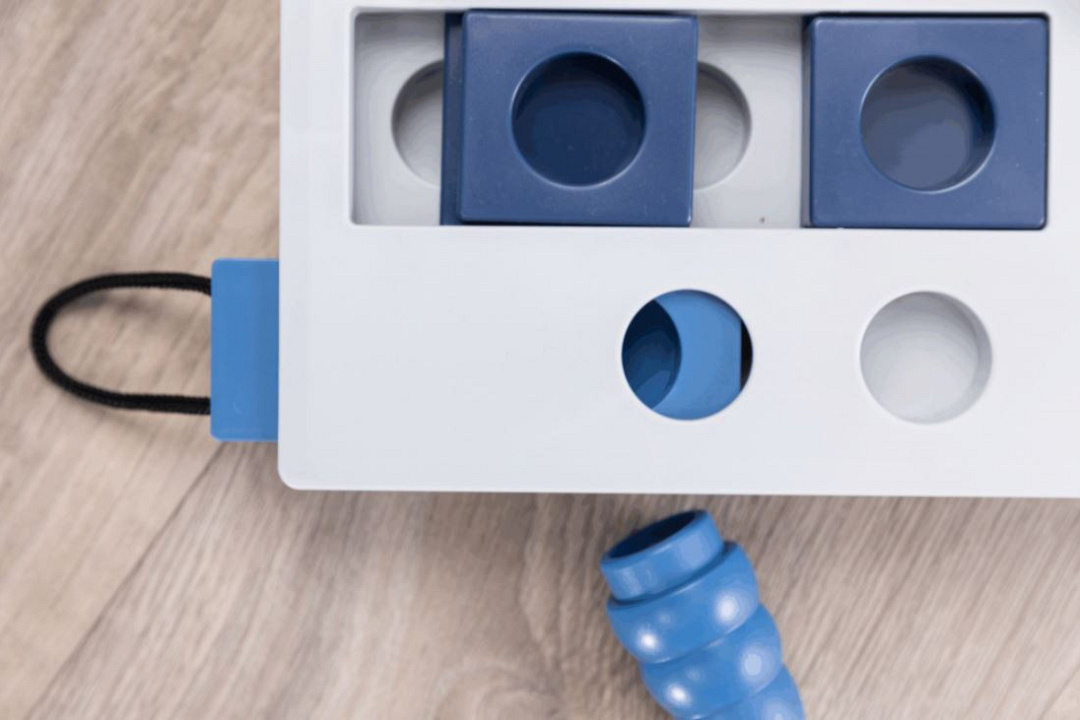 Bordspel voor gevorderde, kleine honden. Door de lades met behulp van lussen te openen en de kegel en schuif te bewegen komt de hond bij de beloning.