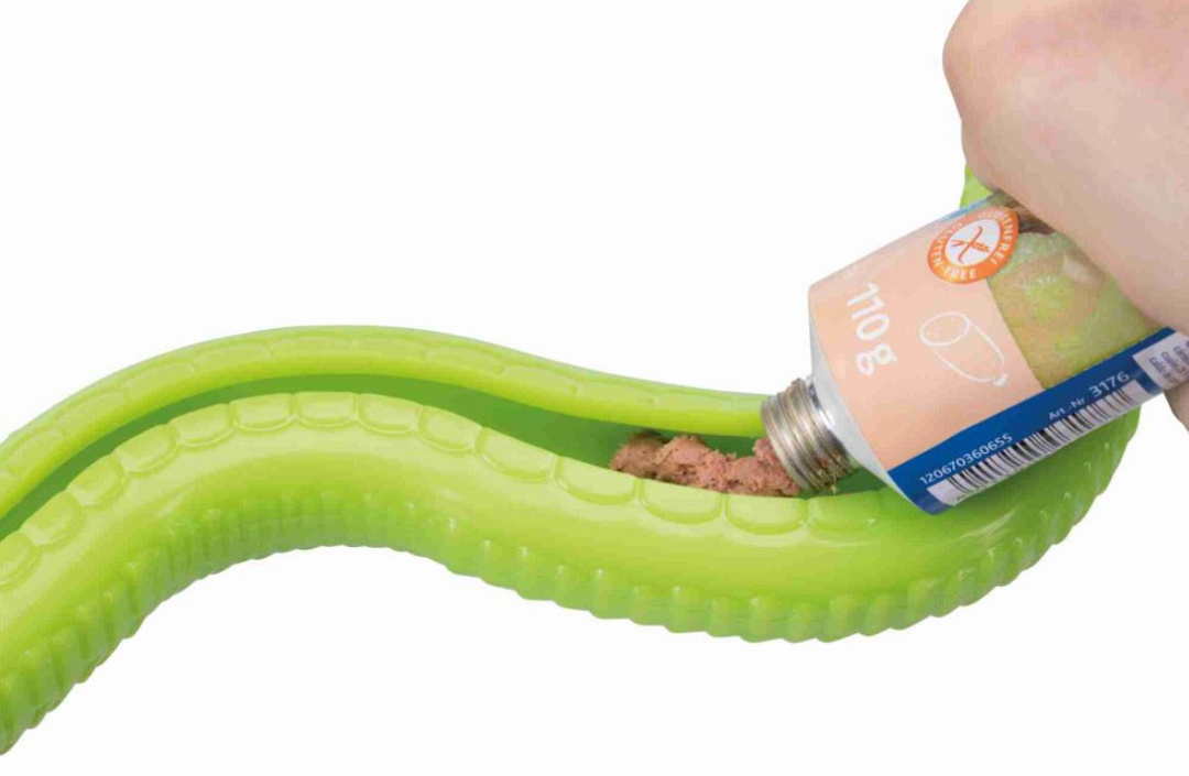 De TRIXIE Snackslang is een speeltje van thermoplastisch rubber (TPR) met een spleetvormige opening aan de onderkant. De slang kan gevuld worden met bijv. leverworst, snoepjes of koekjes.