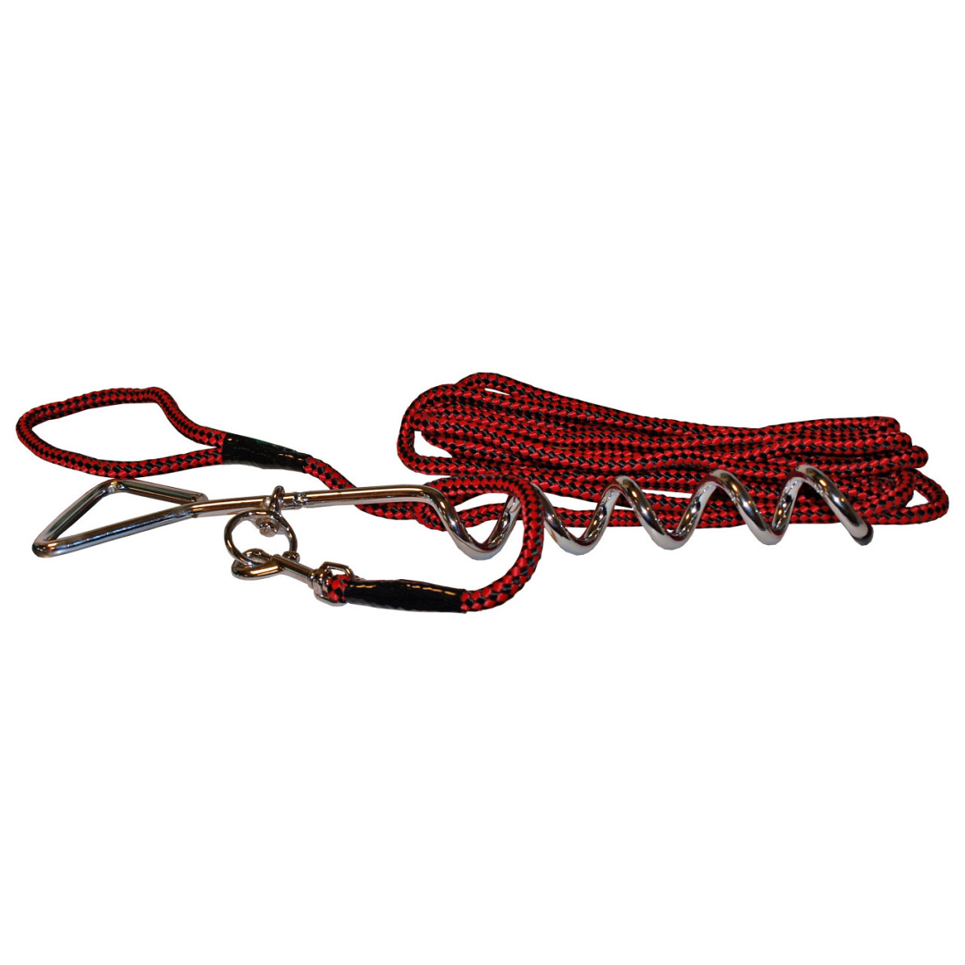 Draai de pen in de ondergrond, bevestig de lijn met de lus aan het oog met de wartel. Het andere eind bevestig je aan de halsband of het tuig van jouw hond. Jouw campingset is klaar voor gebruik.