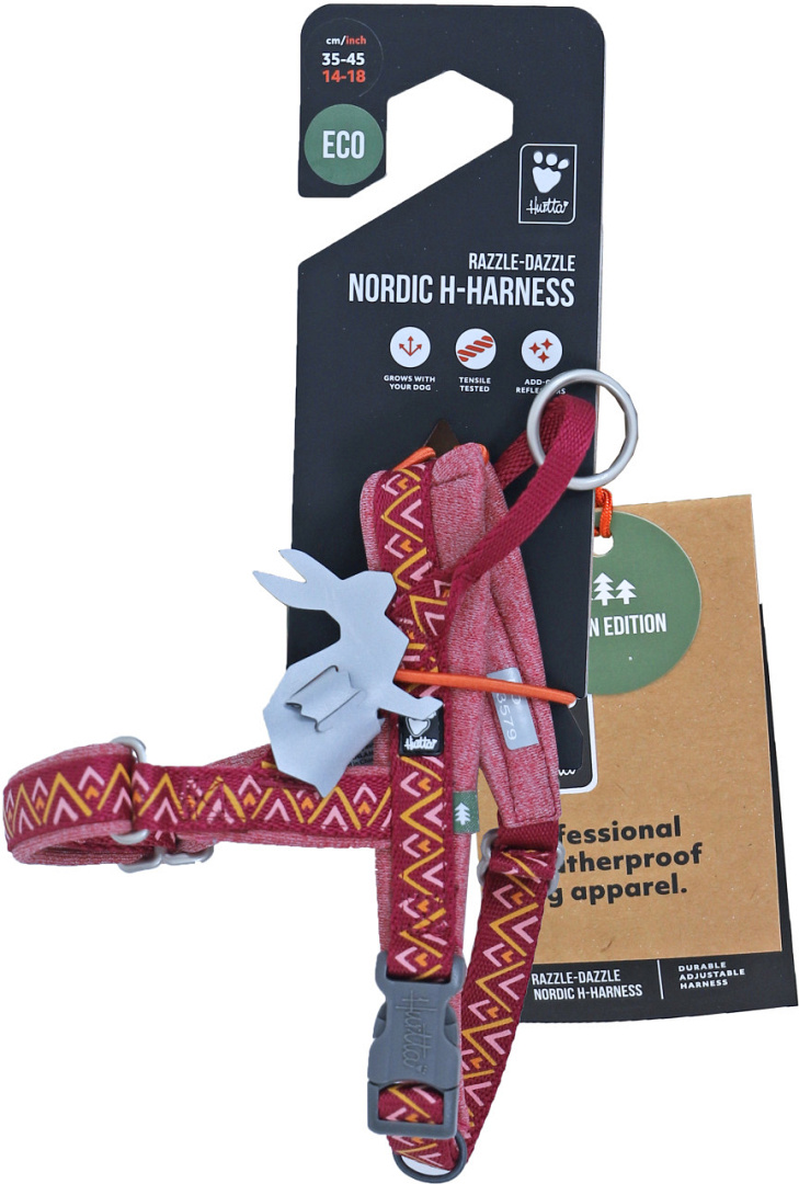 Het Hurtta H-harnas Razzle Dazzle is een verstelbaar tuig gemaakt van gerecycled materiaal. Dit tuig is speciaal ontworpen met een uitstekende pasvorm, omdat het zowel op de borst als onder de buik kan worden versteld. Dit werkt ideaal voor honden die nog in de groei zijn. Het tuig is voorzien van een handvat op de rug inclusief ring om de hond aan te lijnen voor extra veiligheid en controle.