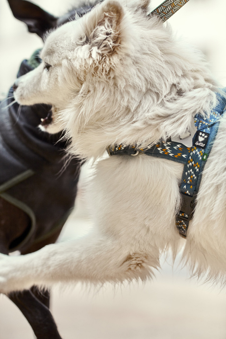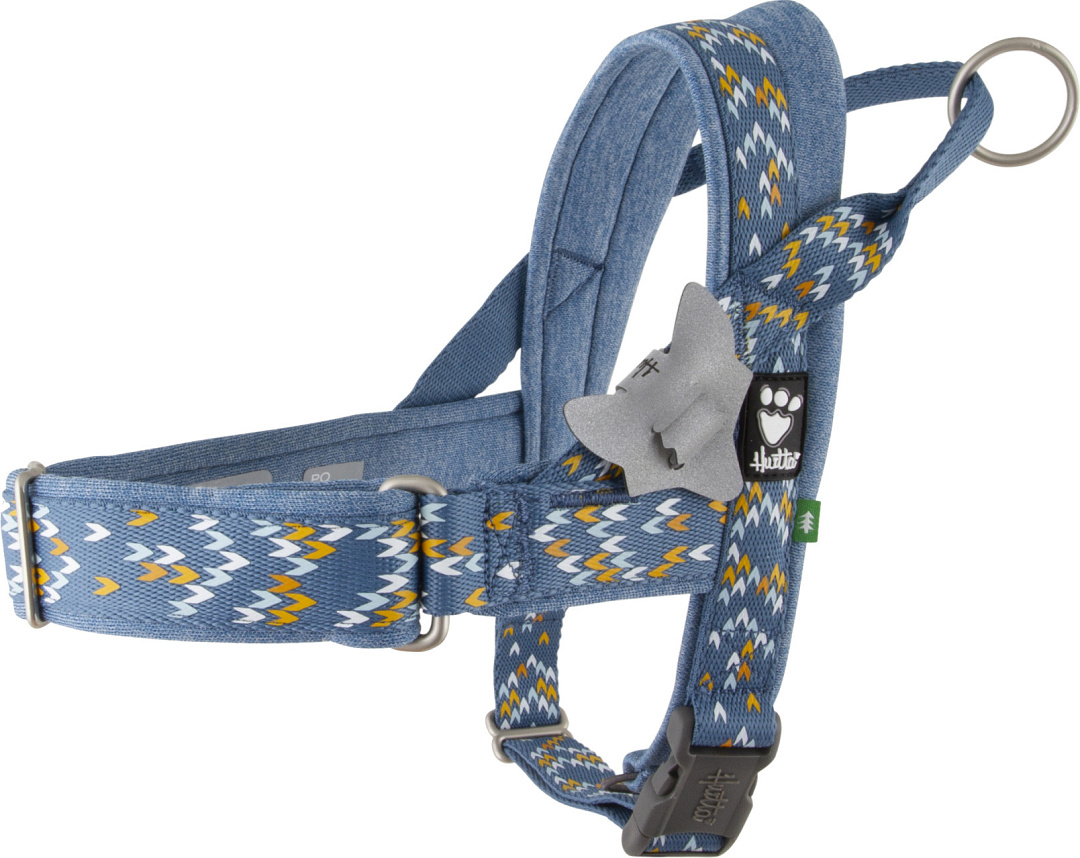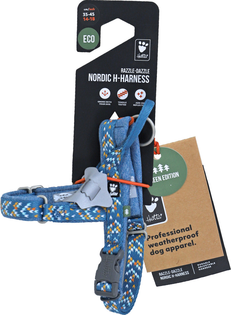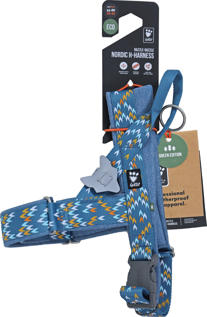 Het Hurtta H-harnas Razzle Dazzle is een verstelbaar tuig gemaakt van gerecycled materiaal. Dit tuig is speciaal ontworpen met een uitstekende pasvorm, omdat het zowel op de borst als onder de buik kan worden versteld. Dit werkt ideaal voor honden die nog in de groei zijn. Het tuig is voorzien van een handvat op de rug inclusief ring om de hond aan te lijnen voor extra veiligheid en controle.