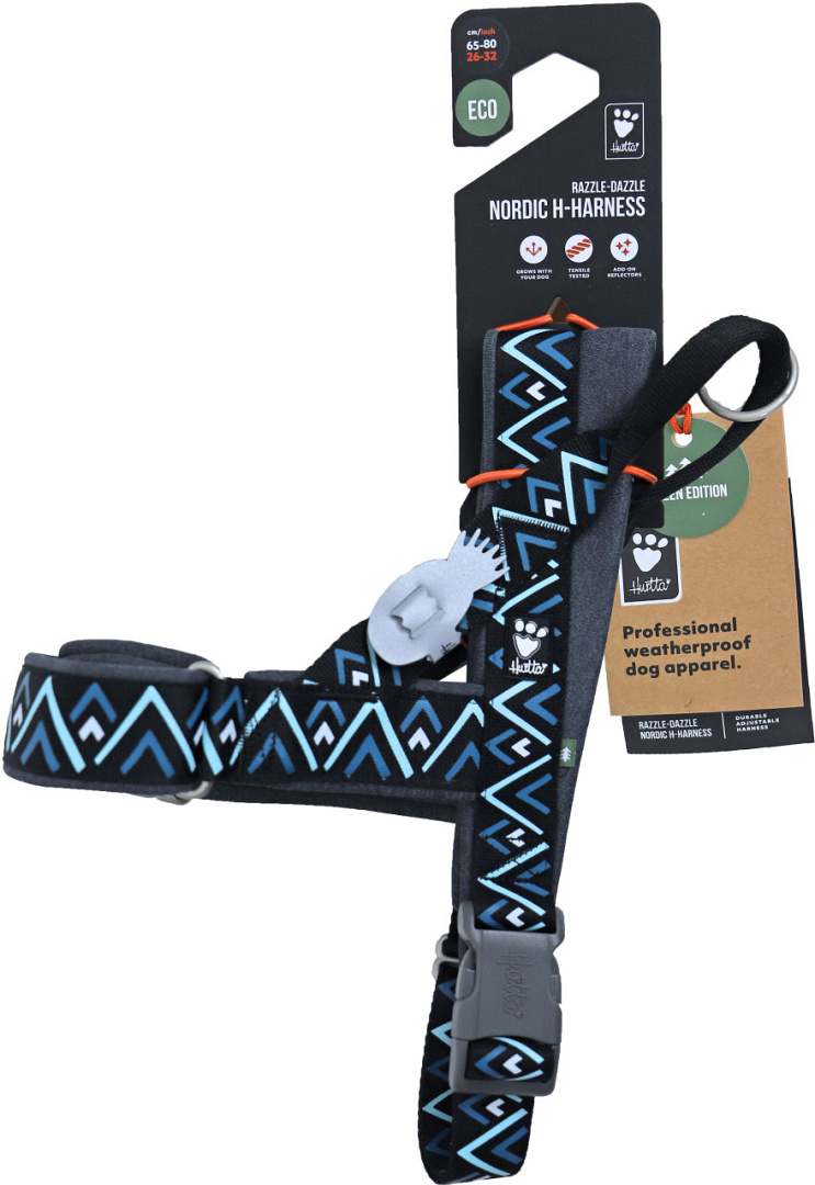 Het Hurtta H-harnas Razzle Dazzle is een verstelbaar tuig gemaakt van gerecycled materiaal. Dit tuig is speciaal ontworpen met een uitstekende pasvorm, omdat het zowel op de borst als onder de buik kan worden versteld. Dit werkt ideaal voor honden die nog in de groei zijn. Het tuig is voorzien van een handvat op de rug inclusief ring om de hond aan te lijnen voor extra veiligheid en controle.