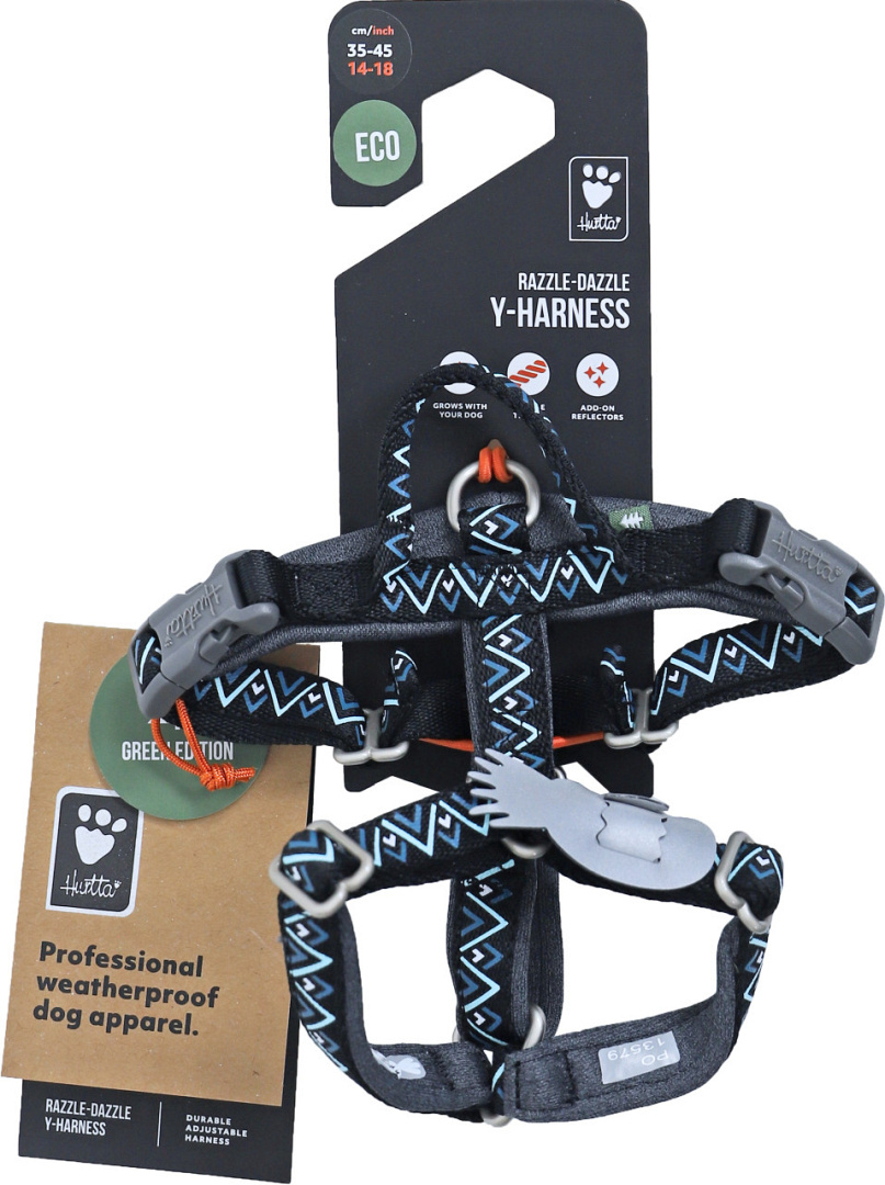 Het Hurtta Y-harnas Razzle Dazzle is een verstelbaar Y-tuig gemaakt van weerbestendig materiaal. Dit tuig is speciaal ontworpen met een uitstekende pasvorm, omdat het zowel op de borst-, nek en buik kan worden versteld. Dit werkt ideaal voor honden die nog in de groei zijn. Het tuig is voorzien van een handvat op de rug voor extra veiligheid en controle. Ook is er een ring op de rugzijde bevestigd om de hond aan te lijnen.