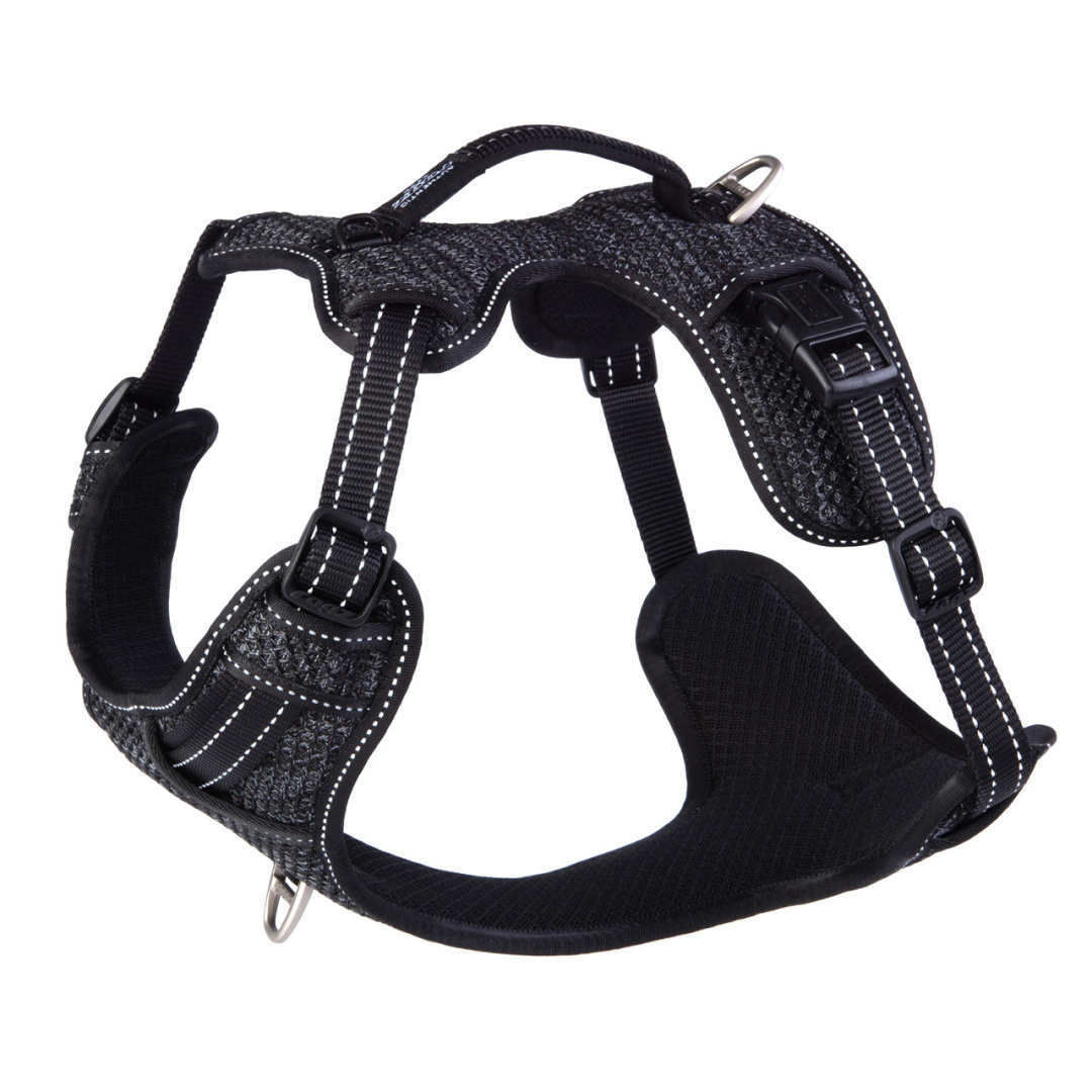 Hondentuig met een gevoerde borst en rugplaat voor extra ondersteuning. Met support handvat voor het ondersteunen bij obstakels.