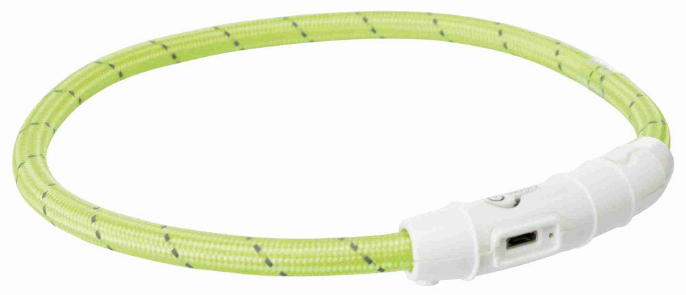 Lichtgevende halsband die via USB-kabel opgeladen kan worden, en kan knipperen of continu licht kan geven.