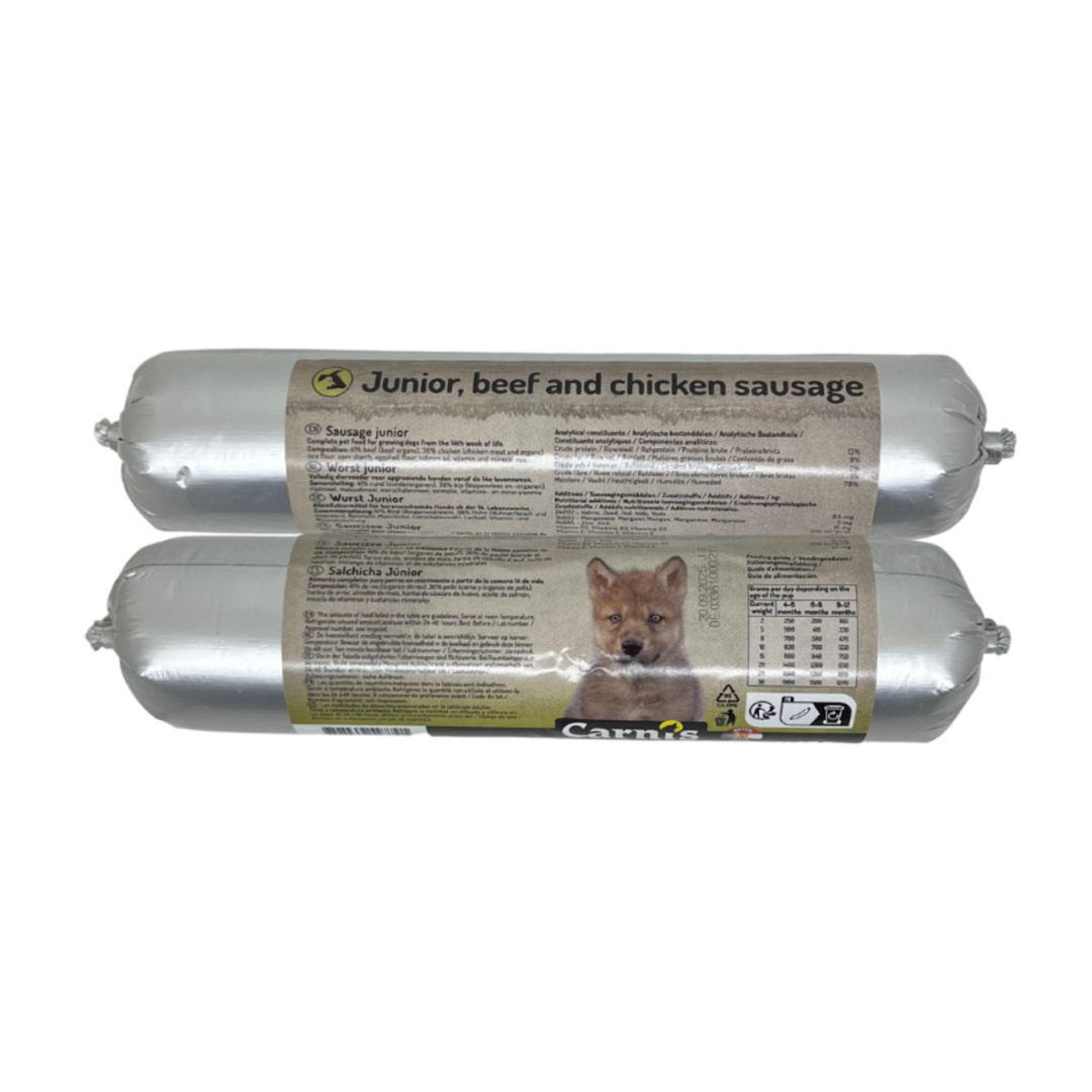 Speciaal voor pups vanaf 14 weken is er Carnis hondenvoer gestoomde worst Junior. Gemaakt van smakelijk rund- en kippenvlees. Een uitgebalanceerde samenstelling die voorziet in de dagelijkse voedingsbehoefte. Te gebruiken in combinatie met droogvoeding of op een vaste dag in de week.
