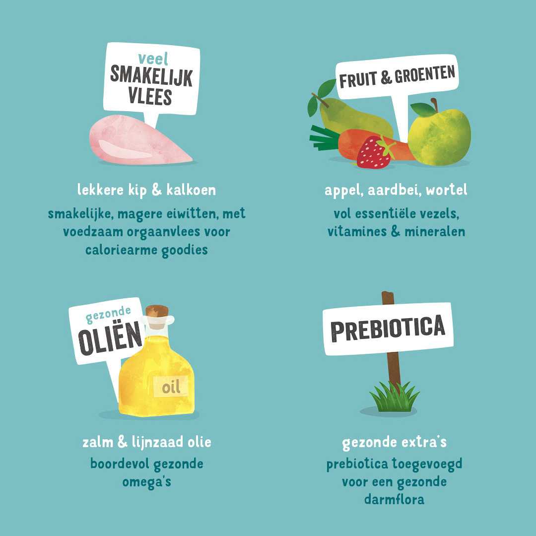 • Kip en kalkoen met proteïnes van hoge kwaliteit voor een gezond immuunsysteem en mager vlees lager in calorieën