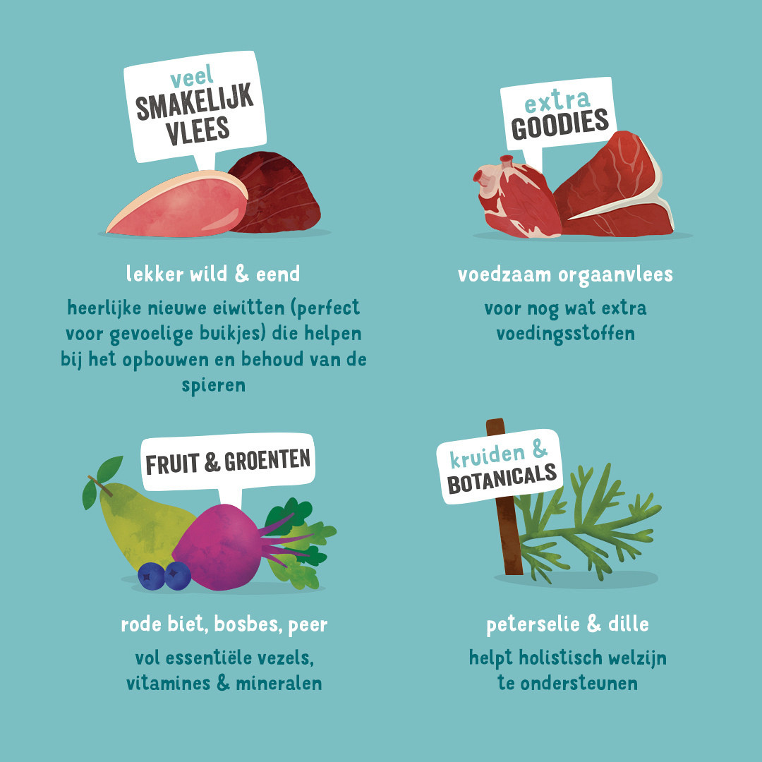 Samenstelling: wild 30%, eend 26%, mineralen, wortels 2%, bataten 1%, rode bieten 1%, cranberry's 1%, appels 1%, peterselie 0,1%, dille 0,1%.
