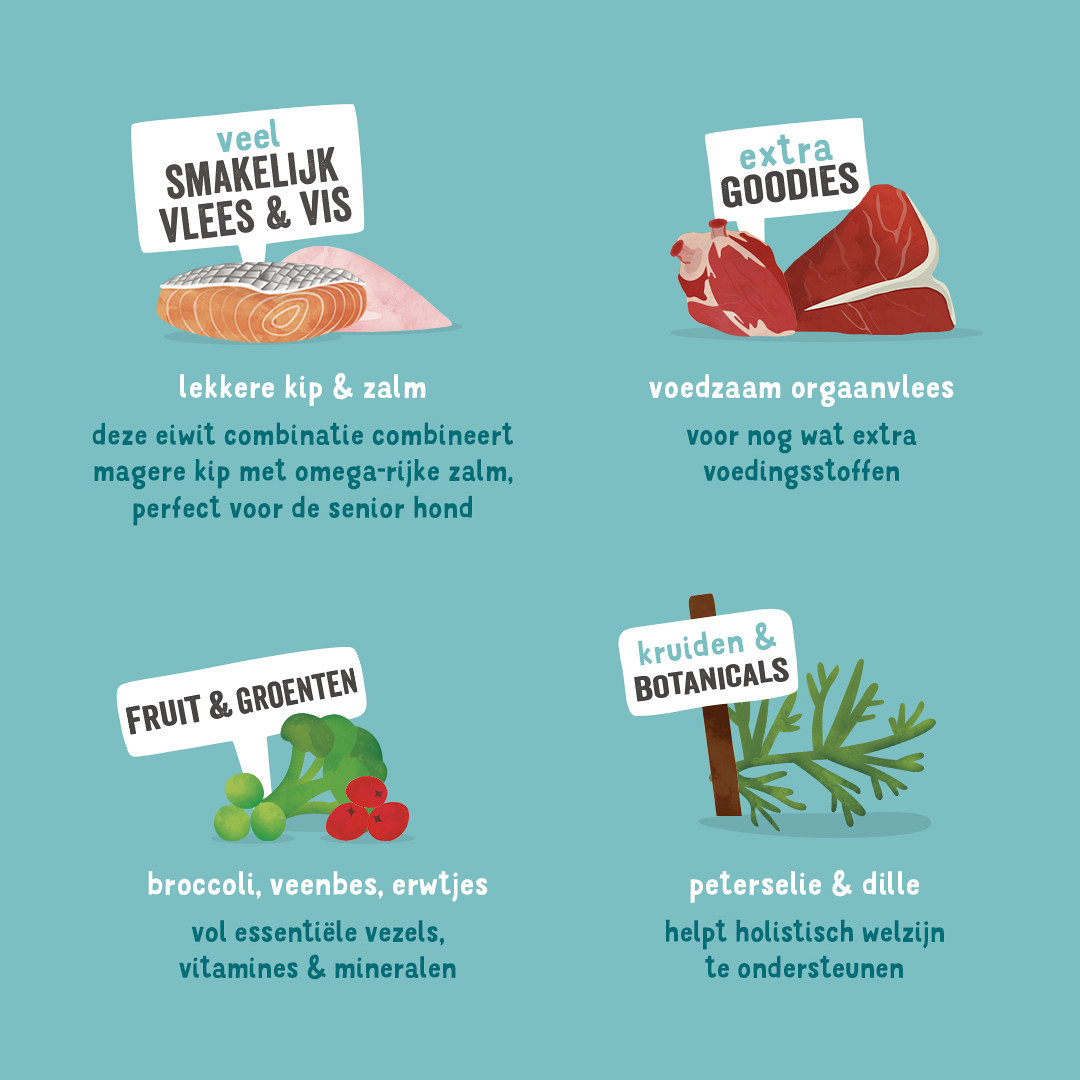 Graanvrij hondenvoer met kip en zalm voor oudere honden vanaf 8 jaar oud