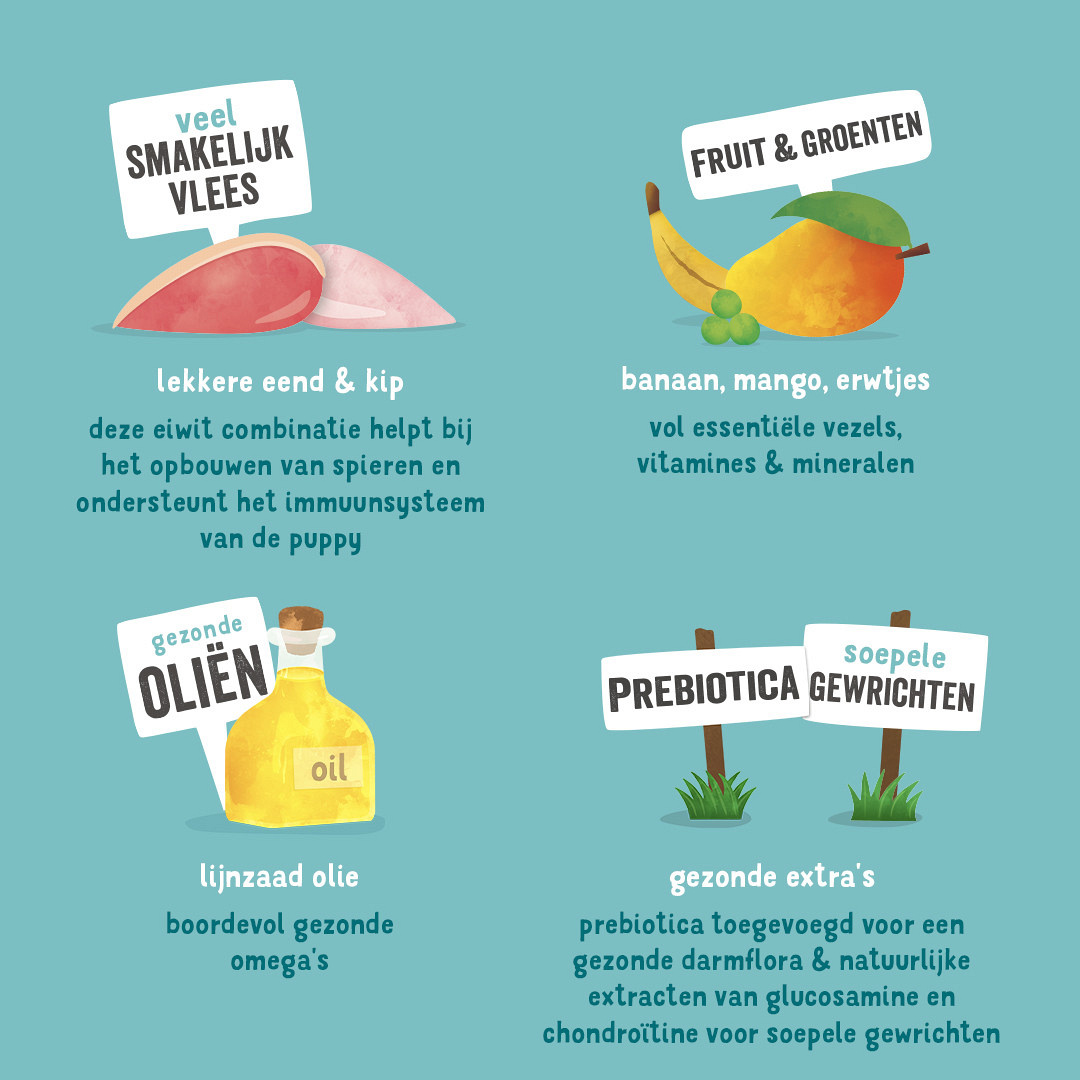 Graanvrij hondenvoer met hoog gehalte eend en kip, voor puppy's.