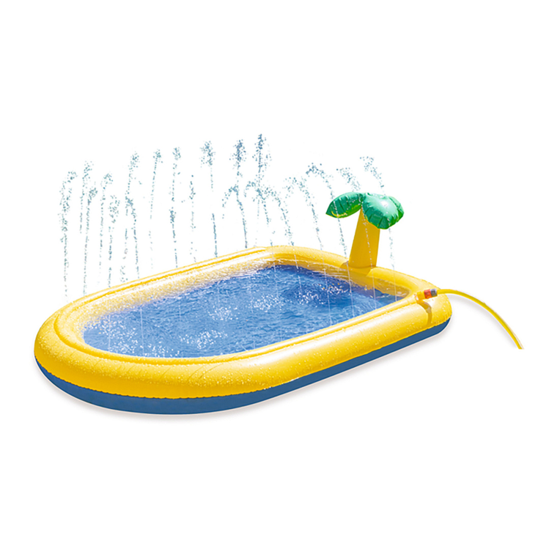 Ondiep hondenzwembad met palmboom en sprinklers voor extra verkoeling en speelplezier.