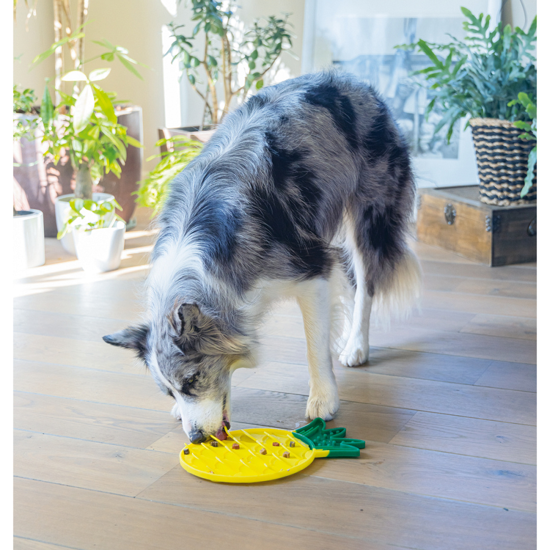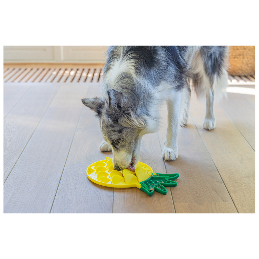 Met de Beeztees likmat Ananas Za geef je jouw hond een smakelijke traktatie en ontzettend veel plezier. Likmat Ananas Za is geschikt voor het verstoppen van hondenvoeding. Of dit nu bestaat uit pate, natvoer, brokjes of misschien wel hondenpindakaas, je kan met deze likmat iedere keer weer een culinaire traktatie aan jouw hond geven.De mat is geschikt om te reinigen in de vaatwasser en kan bovendien ook in de vriezer. Vries de likmat inclusief de voeding in, en geef jouw hond heerlijke afkoeling tijdens de warme zomerdagen.