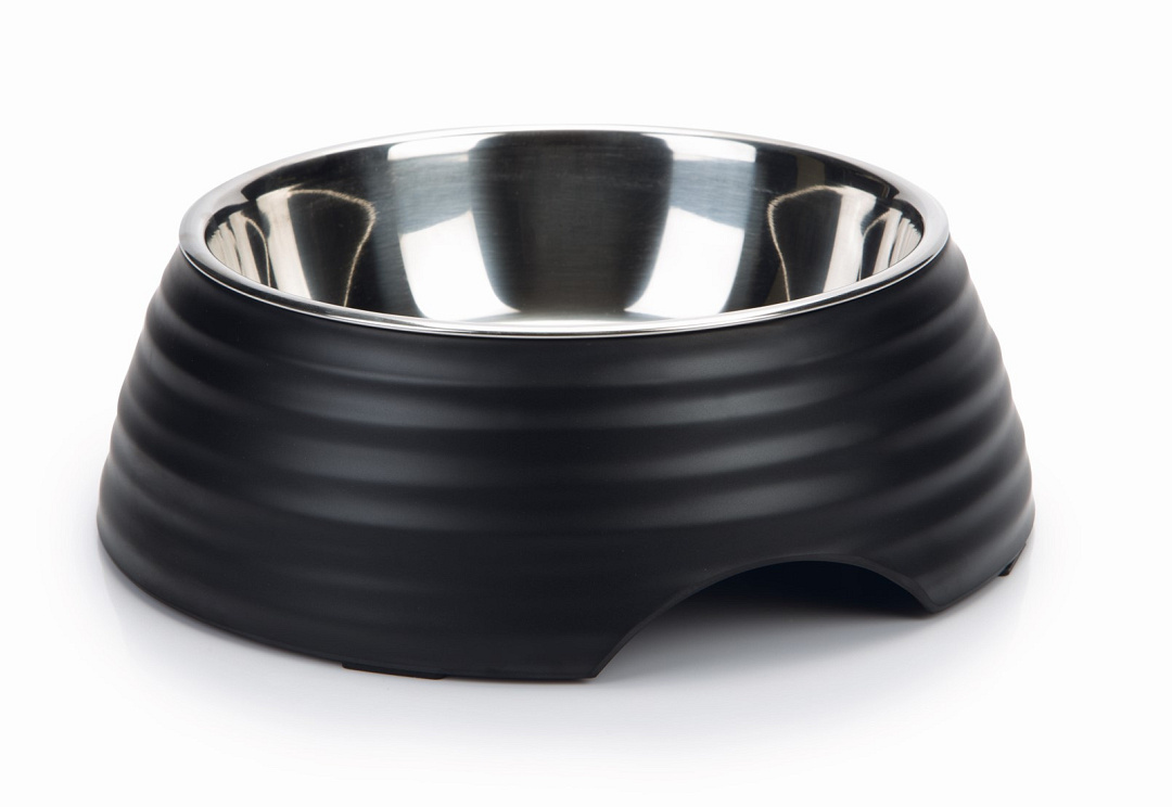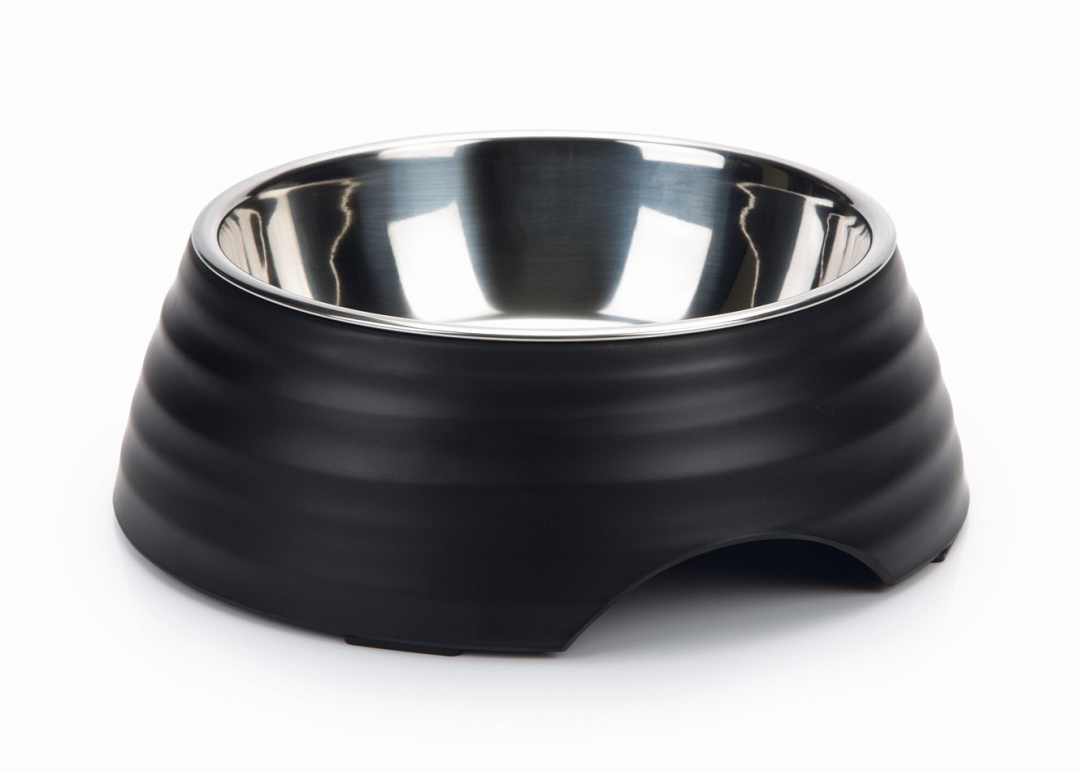 Moderne voerbak van melamine en een vaatwasbestendig RVS bakje.