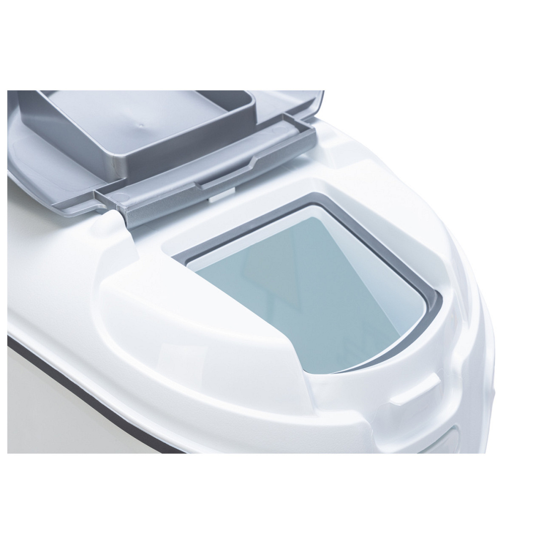 Handige container met wieltjes, voor het bewaren van hondenbrokken. Met klep zodat je de brokjes in de voerbak kunt schenken.