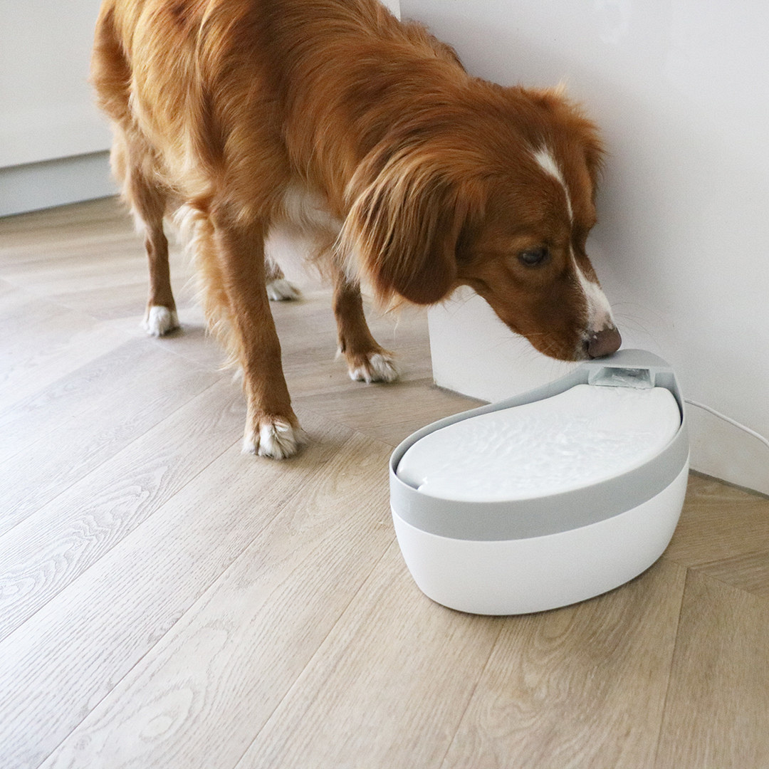 De fontein is voorzien van een draadloze pomp en gescheiden systemen om elektrische lekkage te voorkomen. De rubber voetjes zorgen ervoor dat de fontein stevig op zijn plek blijft staan en dat de vloer niet beschadigd wordt. De fontein kan van het laadstation losgehaald worden om gemakkelijk te vullen.