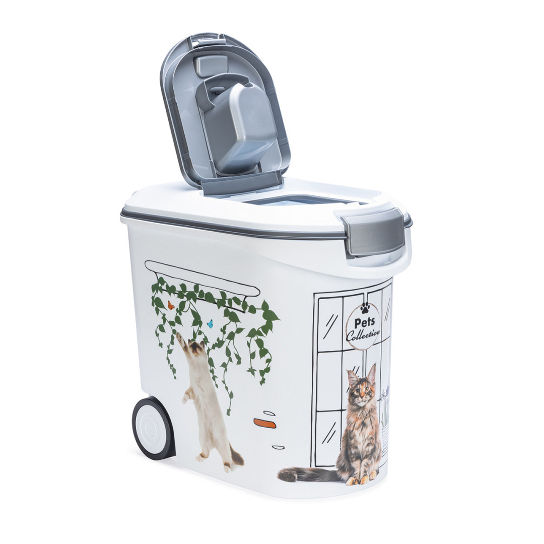 Handige container voor het bewaren van kattenbrokjes. Met klepje zodat je de brokjes in de voerbak kunt schenken.