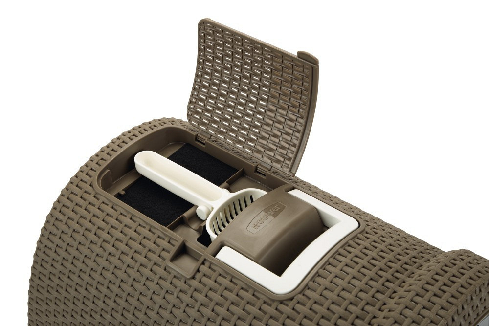 Een prachtig afgewerkte rotan kunststof kattenbak van Curver. Niet alleen een lust voor het oog maar ook zeer gemakkelijk in gebruik.